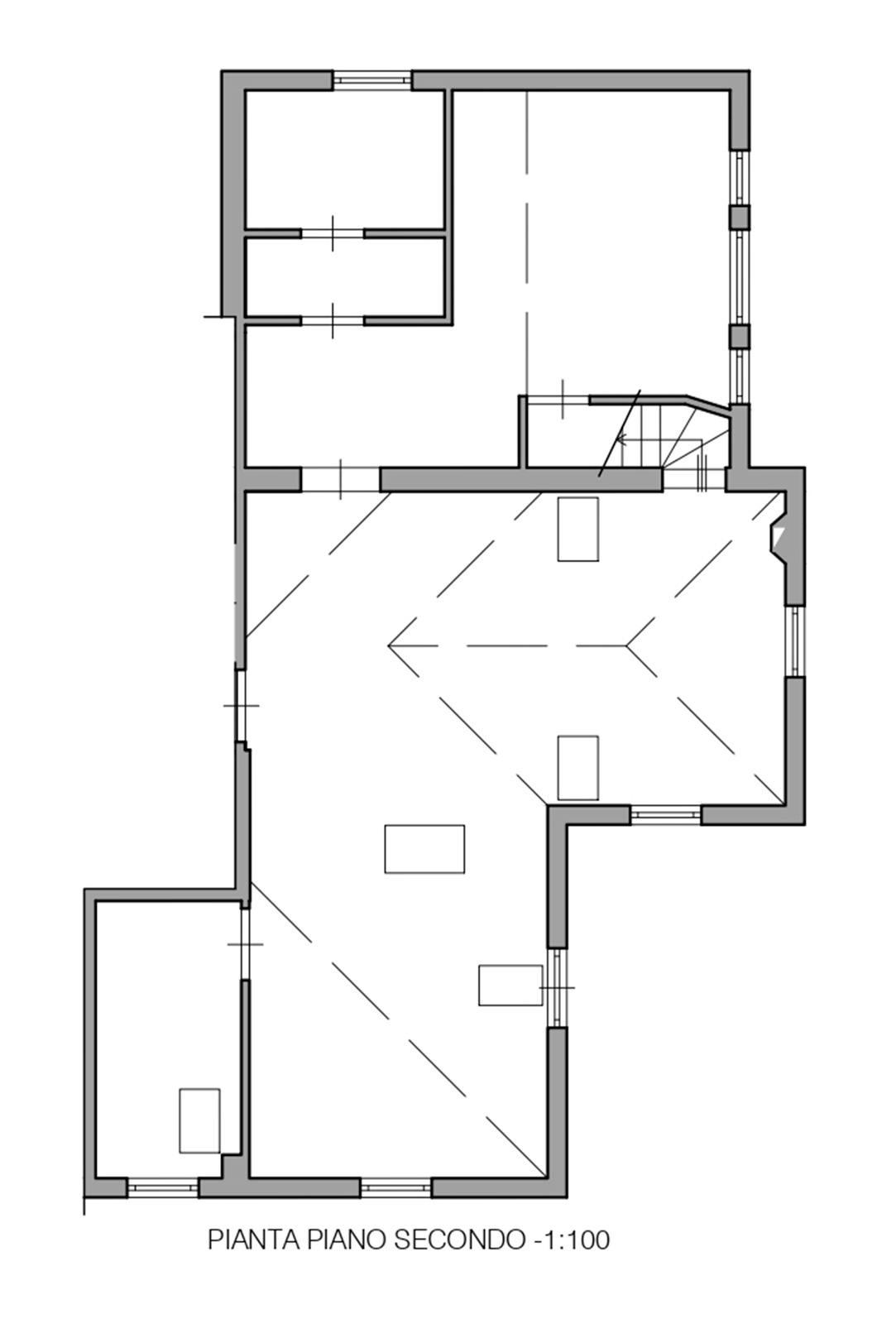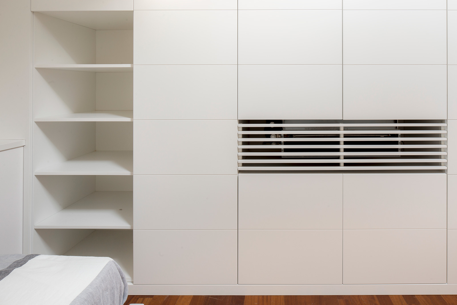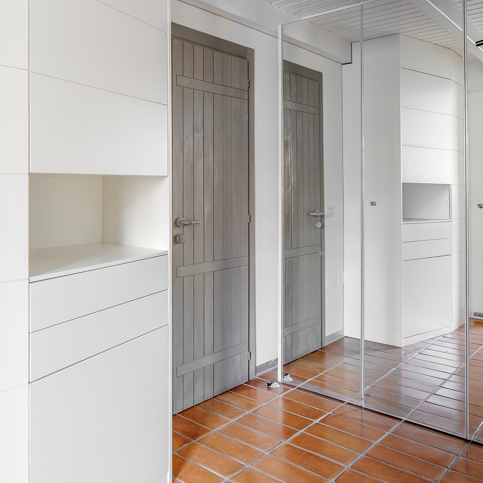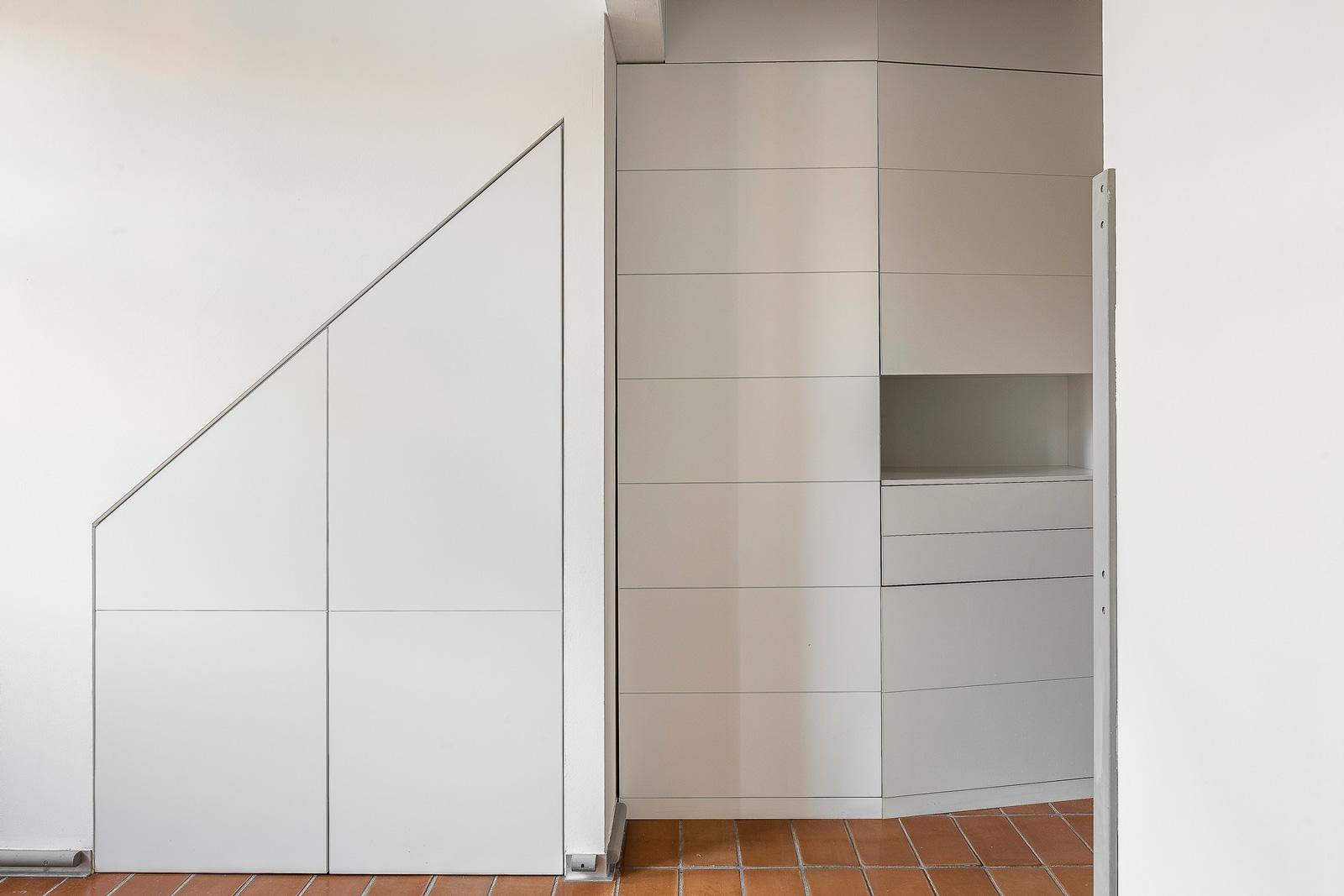 I mobili su misura sono realizzati con un design sobrio e minimalista, tale da proporsi più come pareti attrezzate che come mobili dotati di propria vita. La presenza di tagli di sega orizzontali , scaffalature a giorno, listelli orizzontali passanti, posti nel volume pieno dei mobili alludono discretamente ad astratte griglie geometriche corrispondenti agli spazi interni dei mobili. Le aperture delle ante sono a spinta, senza pomelli o maniglie che avrebbero alterato l’effetto estetico del minimalismo materico dell’insieme.