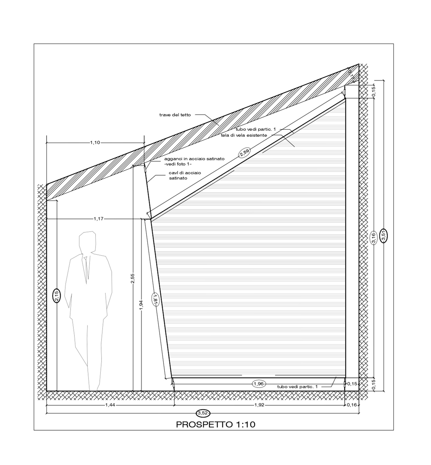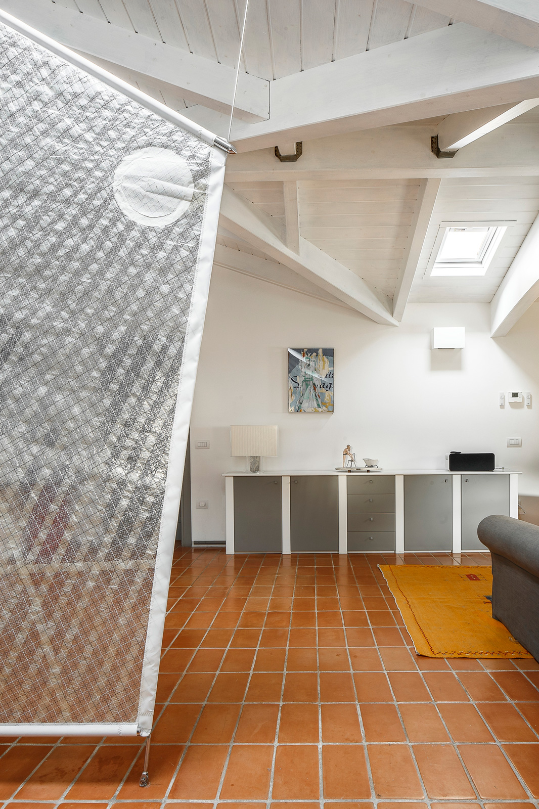 La zona a giorno è divisa da una vela da imbarcazione, fissata al pavimento ed al soffitto da cavi in acciaio . Questo divisorio leggero, semitrasparente, sospeso da terra costituisce una separazione discreta che lascia intatta la vista complessivo dello spazio living. La sua presenza, unitamente alle aperture rotondeggianti ad oblò allungati, restituisce vagamente l’immagine di una architettura di mare.