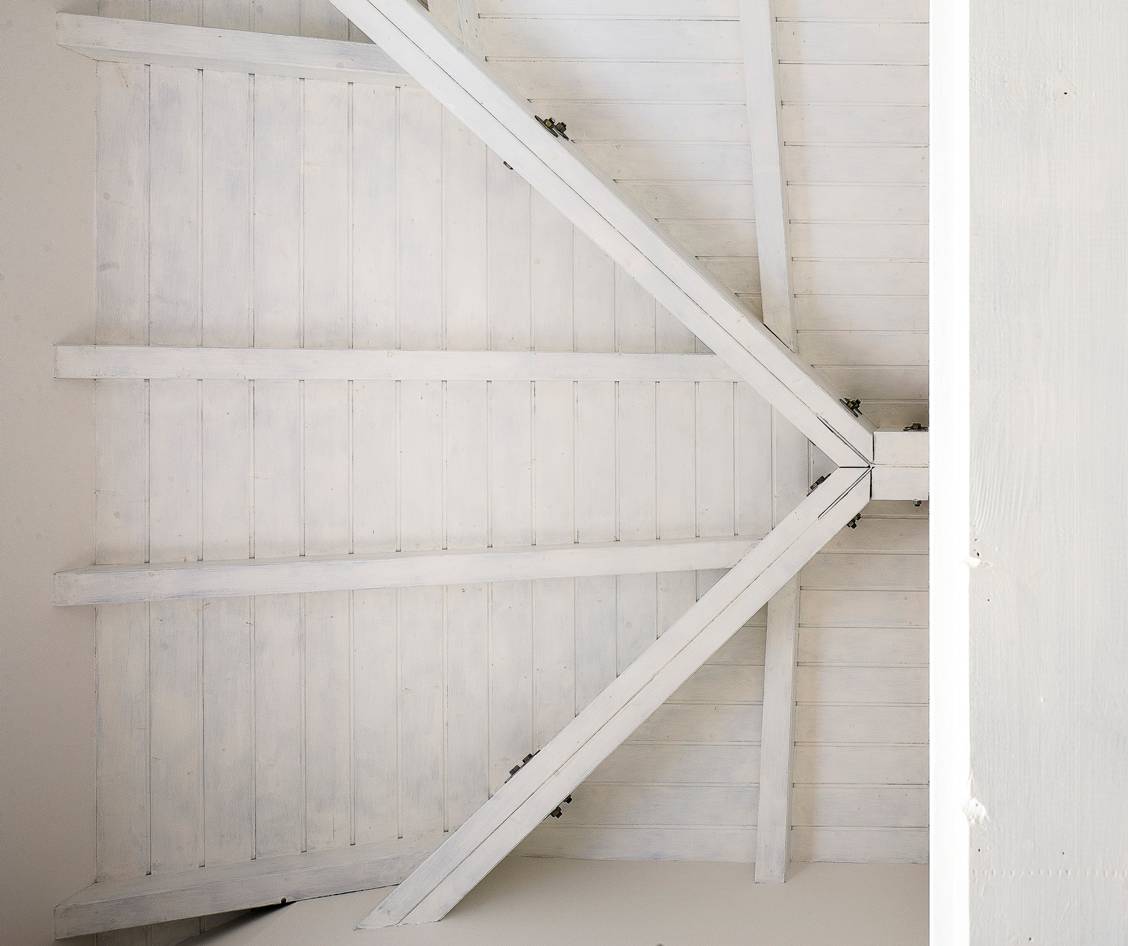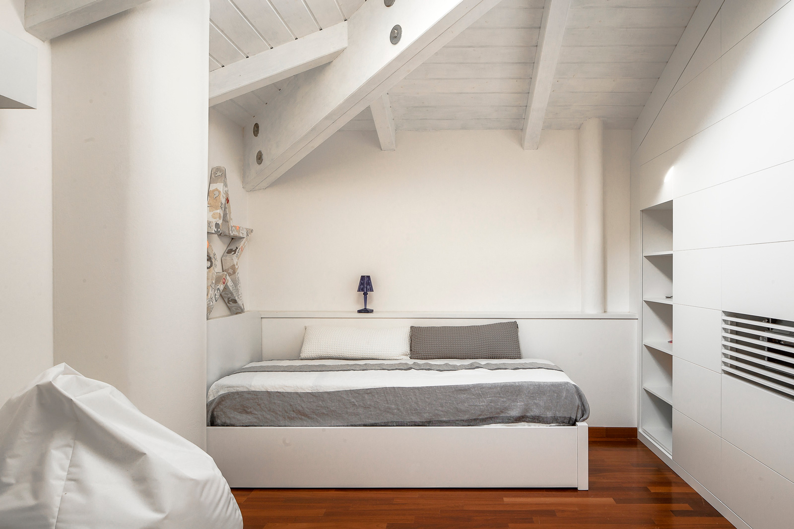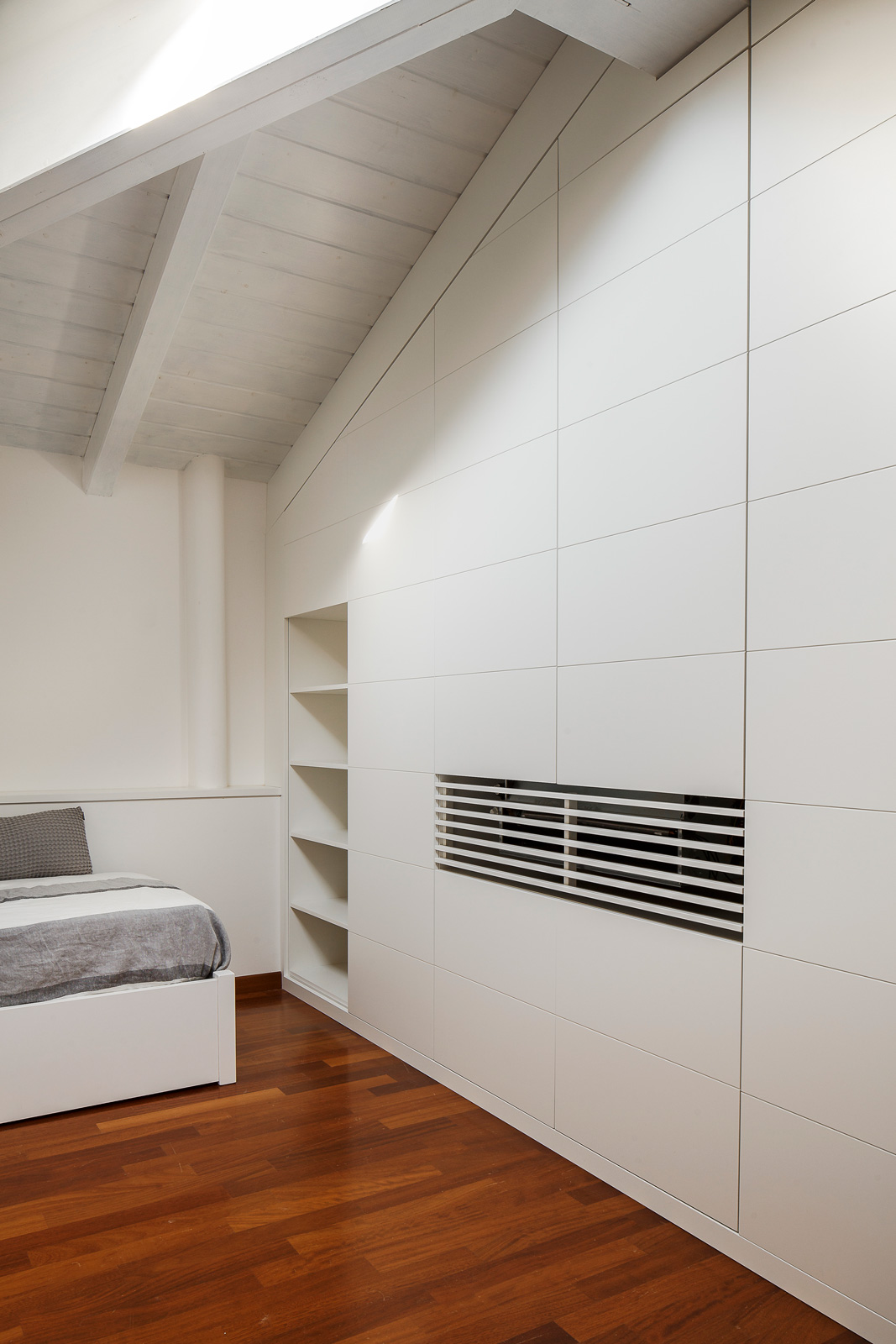 Il colore bianco uniforma lo spazio architettonico e i mobili, diventando il motivo dominante degli ambienti interni. Anche la copertura lignea è stata tinteggiata di color bianco al fine di rendere gli spazi del sottotetto più luminosi e fruibili rispetto al legno color noce preesistente.
