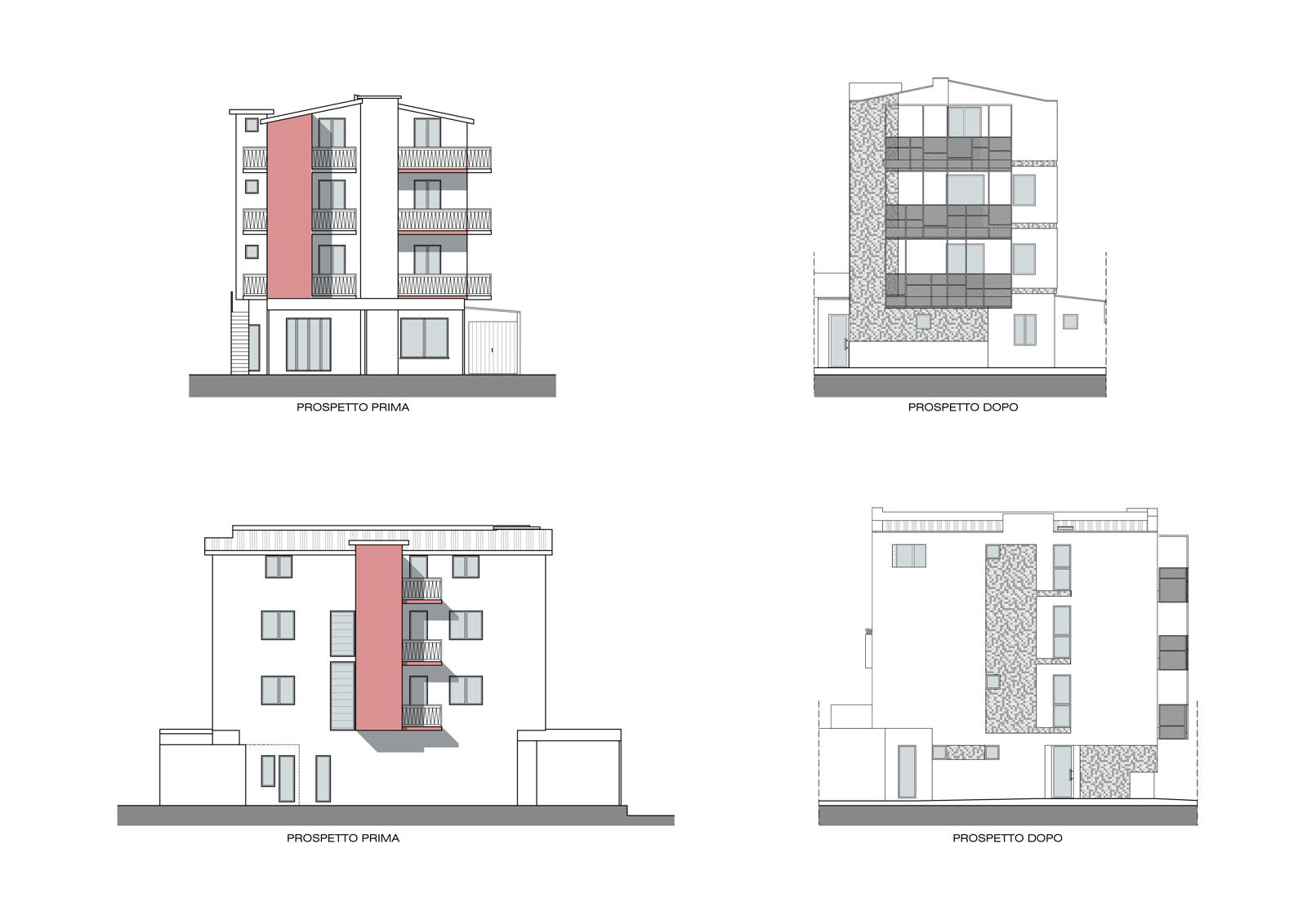 L’intervento progettuale ha comportato la ristrutturazione edilizia totale con cambio d’uso da albergo a residenza. In particolare sono stati eliminati tutti i corpi aggettanti dalla sagoma principale ( servizi igienici ed il vano ascensore), sia per soddisfare la riduzione della superficie utile complessiva, sia per ottenere un’immagine nitida e riconoscibile del fabbricato.