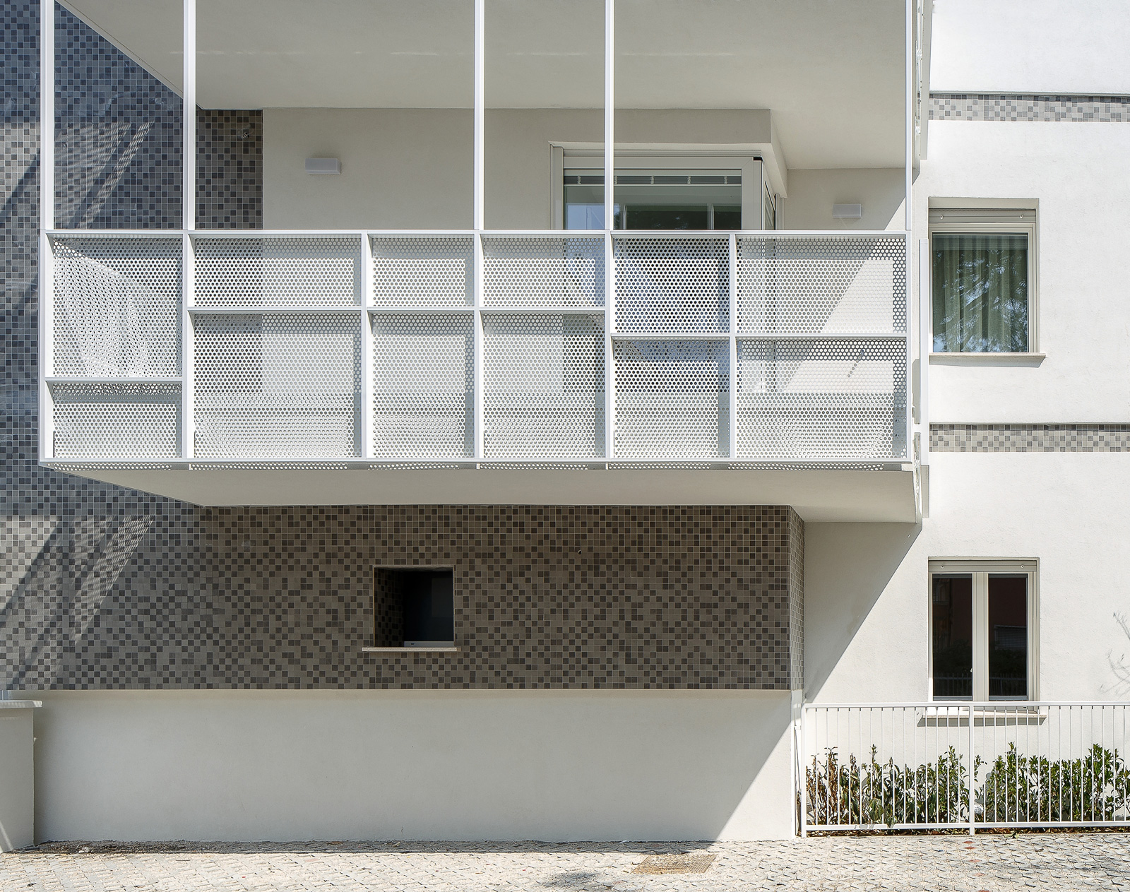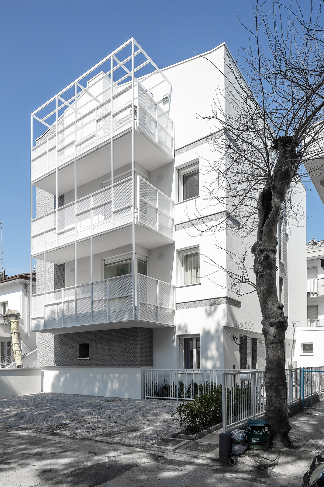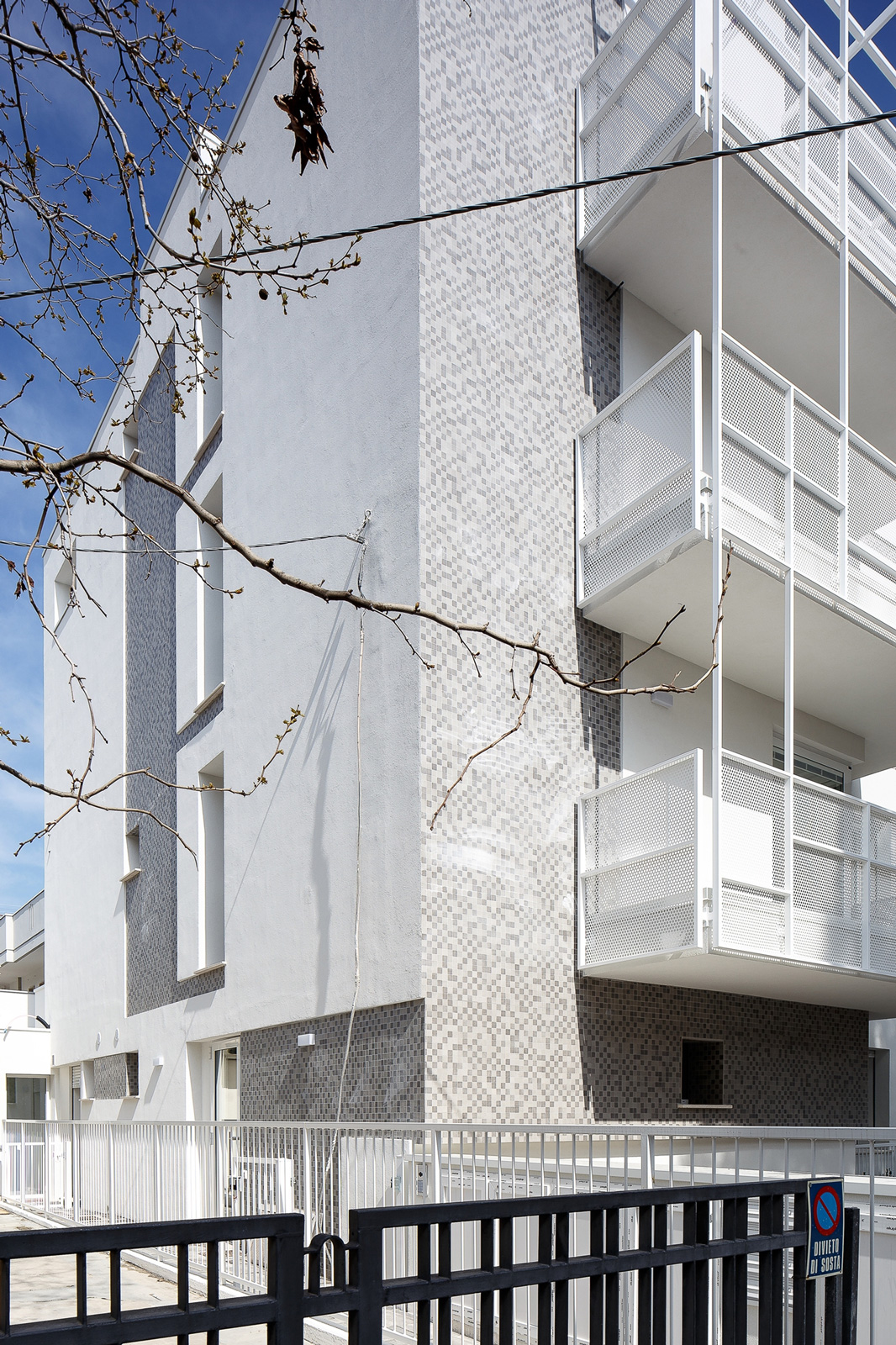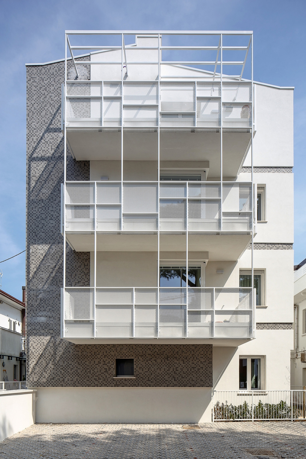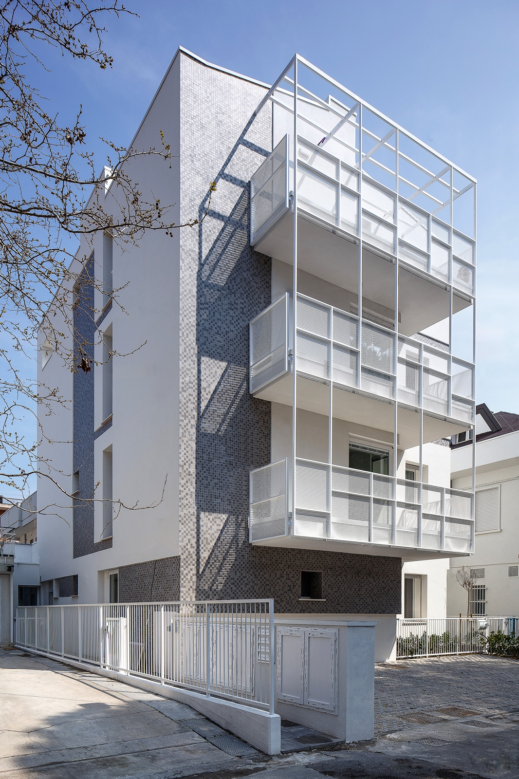 Esternamente il fabbricato è stato caratterizzato in facciata in parte da un rivestimento con tessere di mosaico e in parte da un intonaco a tinta chiara. I parapetti dei balconi sono stati realizzati da una struttura metallica con lamiere forate in acciaio zincato e verniciato.