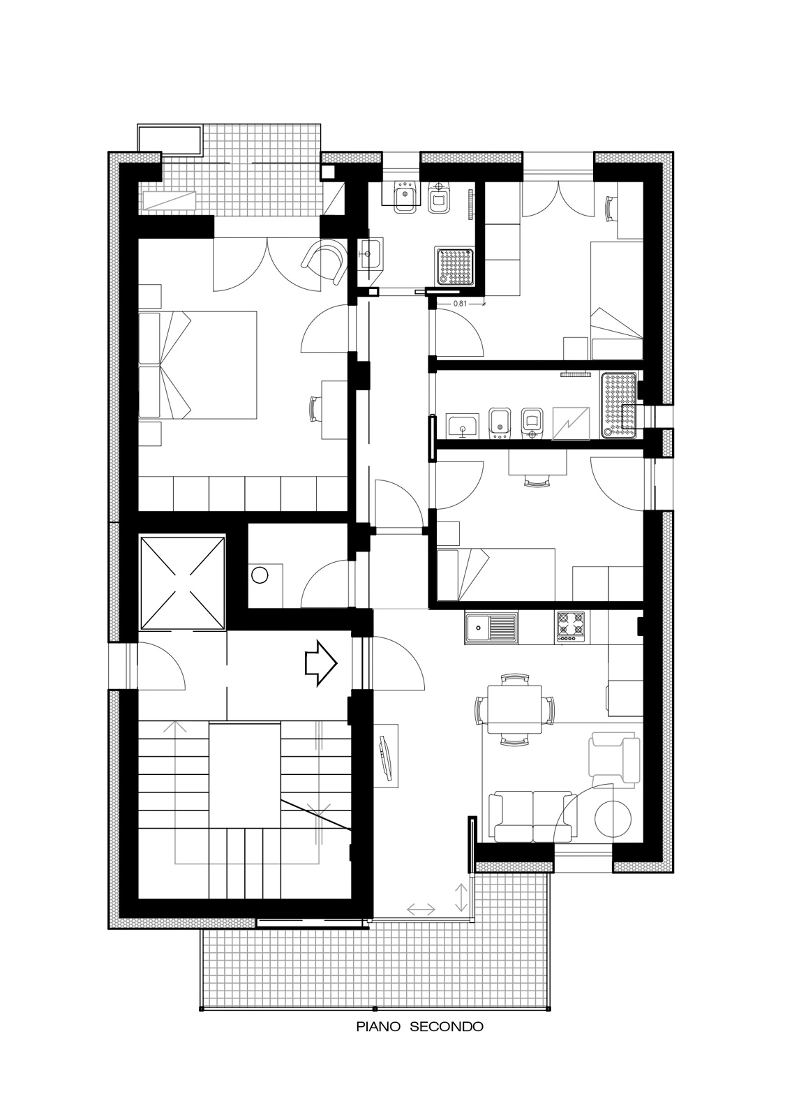 La porzione di fabbricato ad un piano fuori terra sul retro è stata demolita integralmente e ricostruita sullo stesso sedime; è stato ricavato un patio aperto per soddisfare le esigenze di aereazione ed illuminazione dell’appartamento afferente.