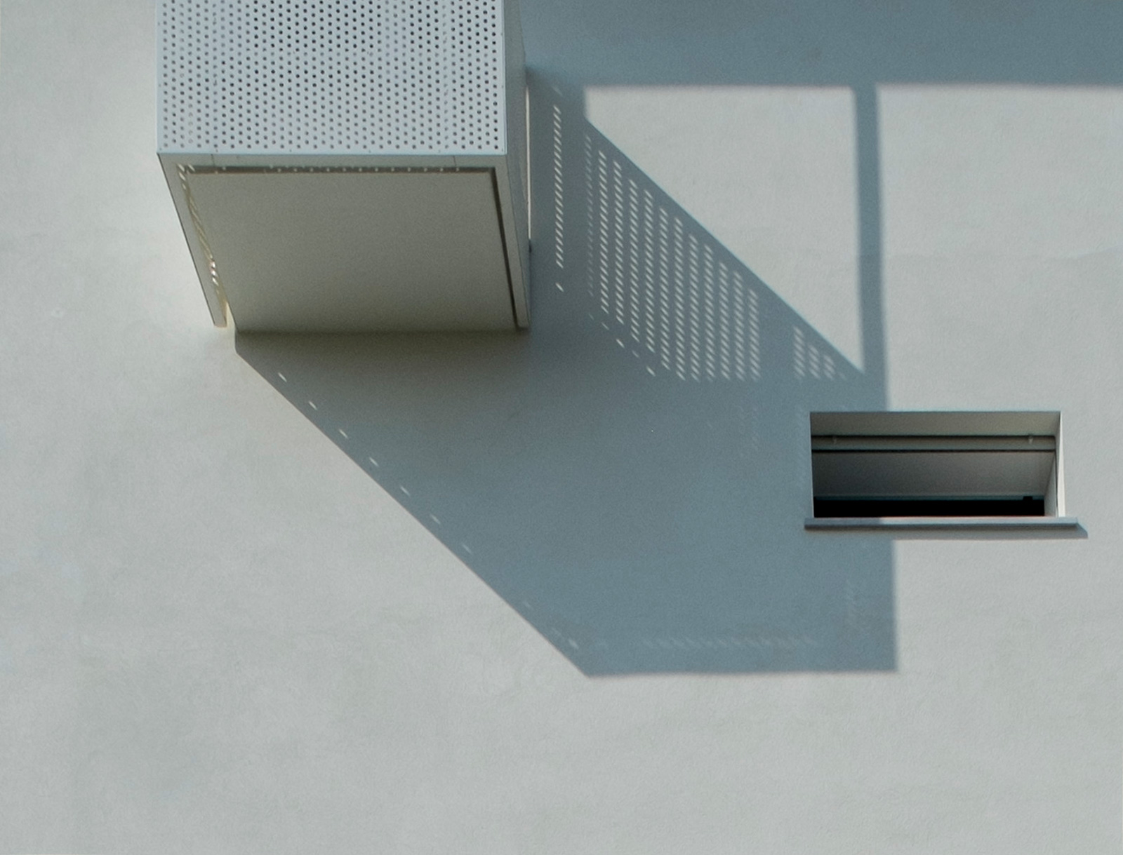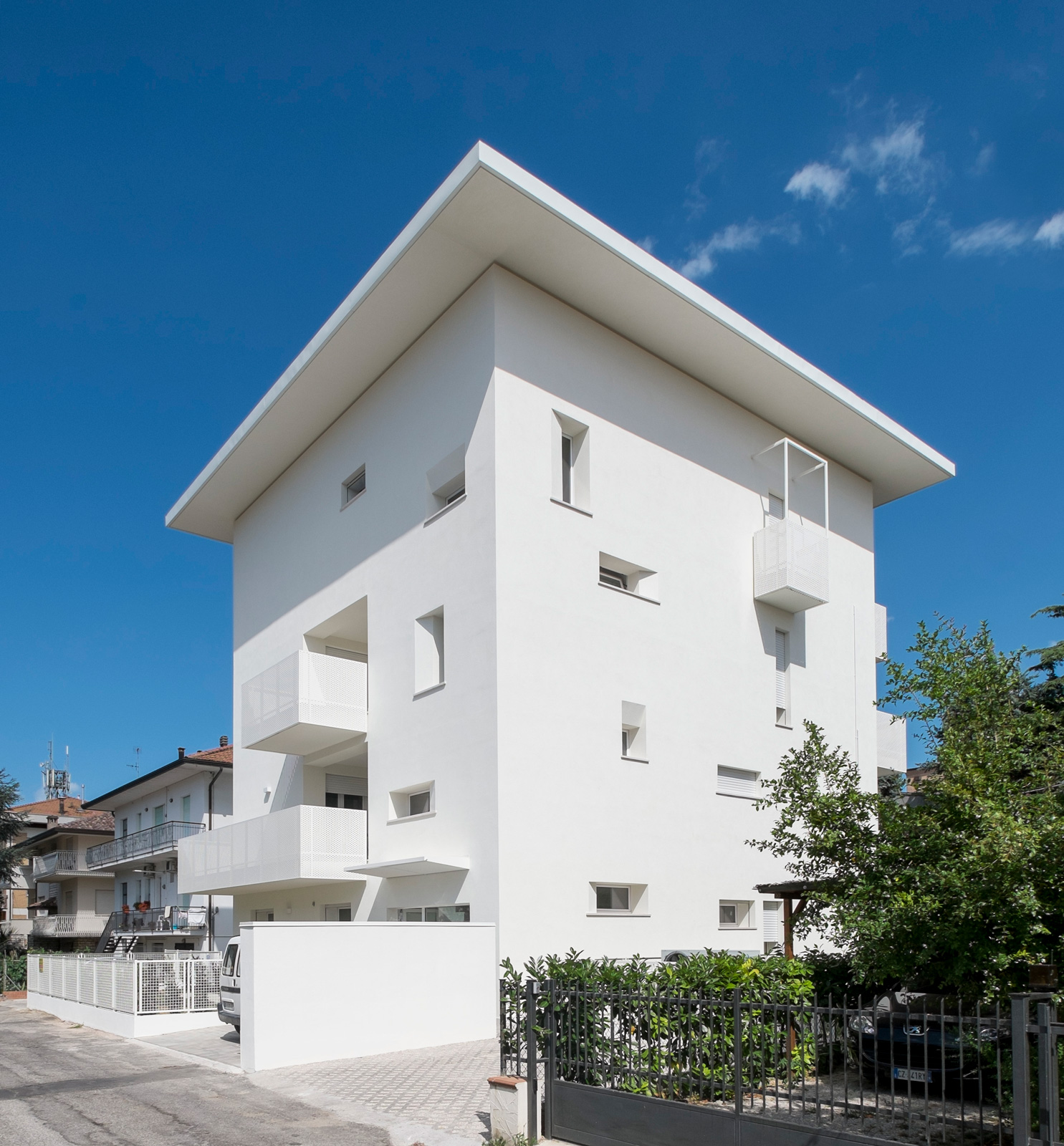 Il bianco (o non colore) va ad uniformare il tutto, a sottolineare l’edificio pensato come oggetto immerso in un unico colore, nel quale non esistono priorità cromatiche nè elementi da esibire; il colore unico lascia la leggibilità dell’insieme unicamente alla luce naturale “donatrice di ogni presenza” ,come ebbe a dire L. Kahn. La tinta unica vuole anche rappresentare un piccolo manifesto contro la tendenza, molto in uso in zona, a vivacizzare elementi e componenti architettonici con diversi colori, anche in assenza di esigenze architettoniche.