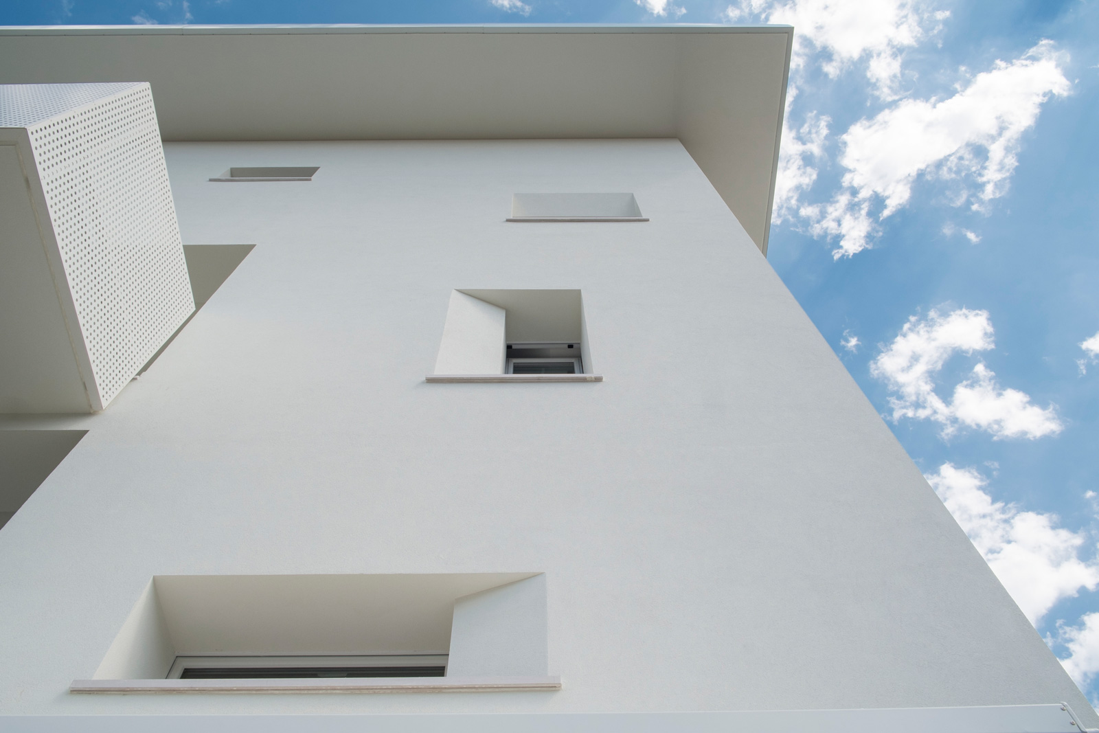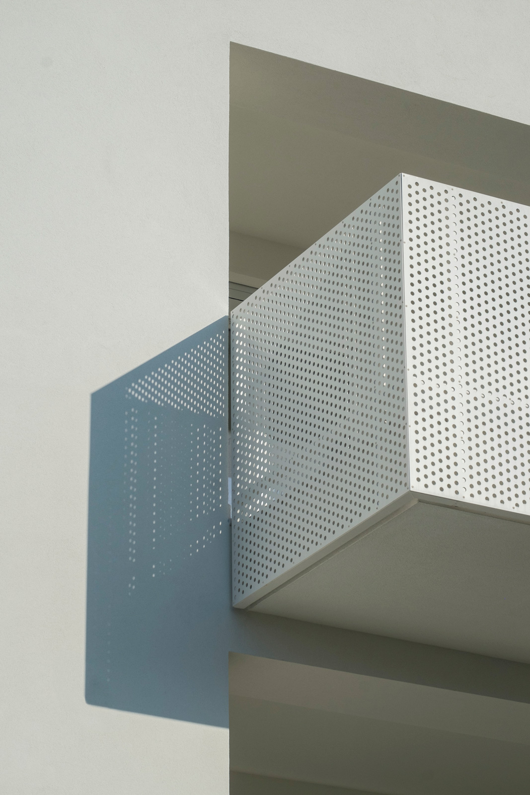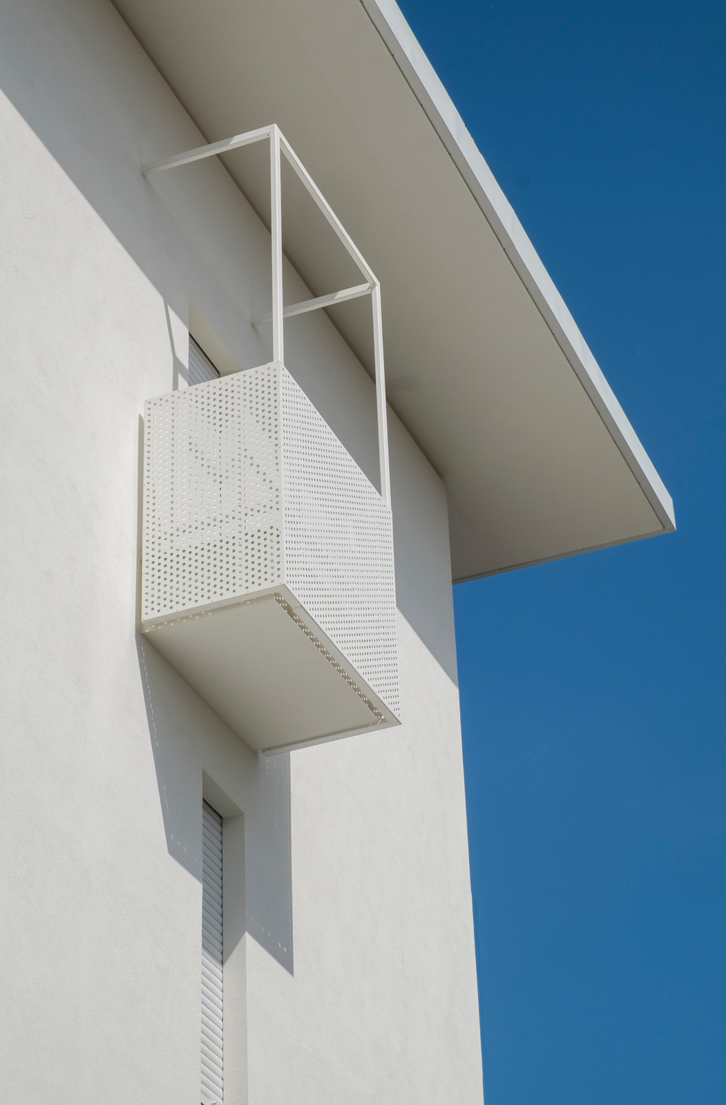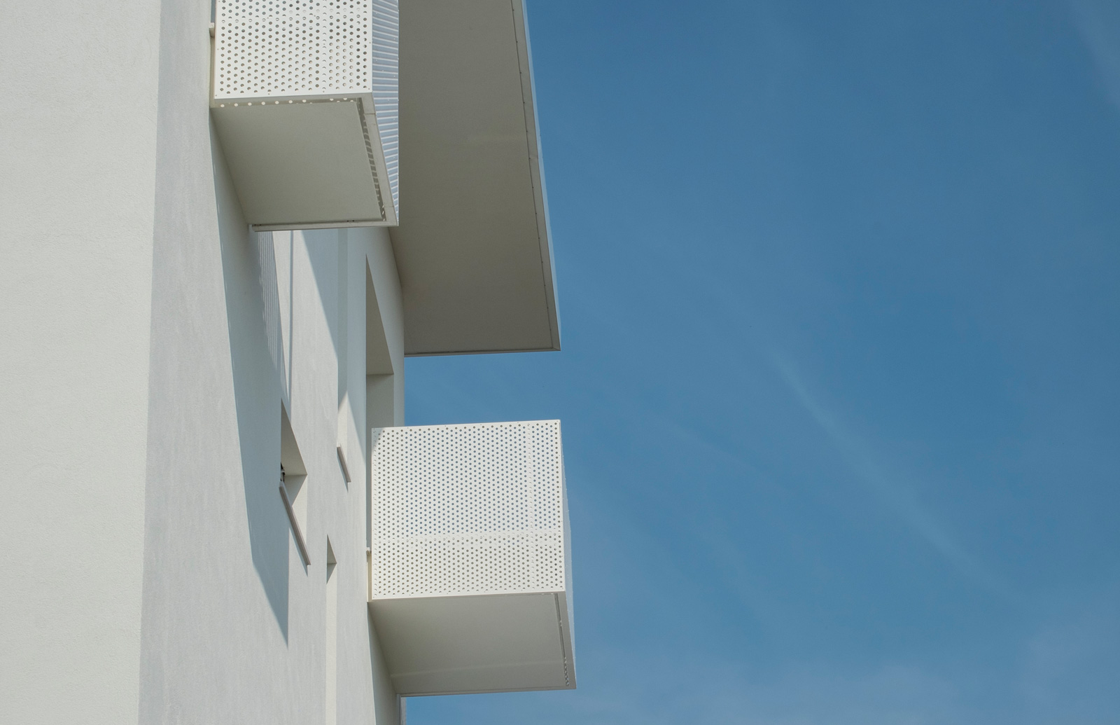 I materiali impiegati si riducono a due: l’intonaco per le facciate e l’acciaio per le ringhiere dei balconi; per le quali sono stati utilizzati fogli di lamiera forata, a maglia romboidale con fori rotondi, avvitati alle retrostanti strutture di supporto. I balconi si presentano non tanto come piani passanti, ma “pieni” volumetrici in grado di proiettare un’ombra abbastanza riconoscibile. Sono pensati come cassetti che si estraggono ,esattamente, dalle rientranze delle logge, quasi costituissero un ordigno meccanico.