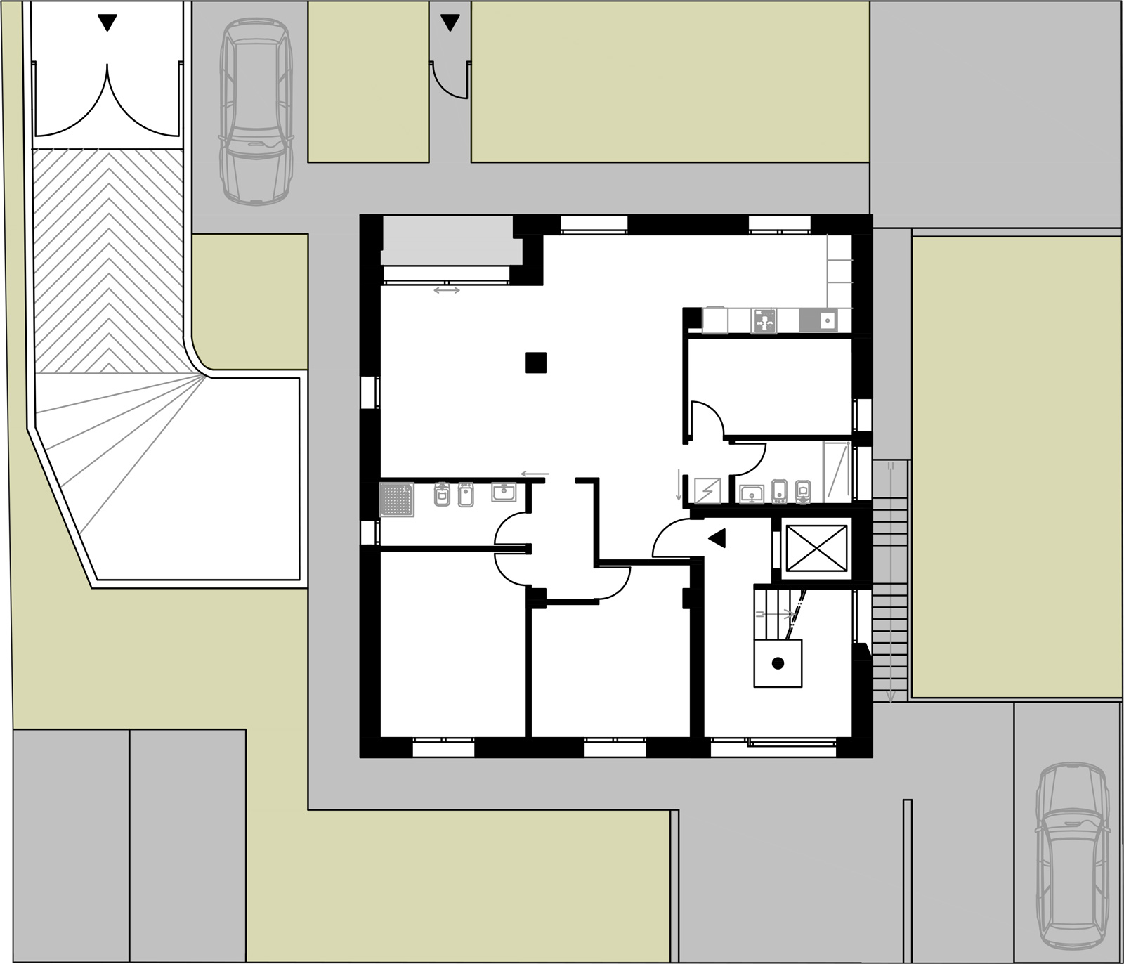 Particolare studio è stato dedicato al vano scale, caratterizzato da finestre irregolari ed a parziale strombatura, in grado di disegnare asimmetricamente l’arrivo della luce naturale esterna.
