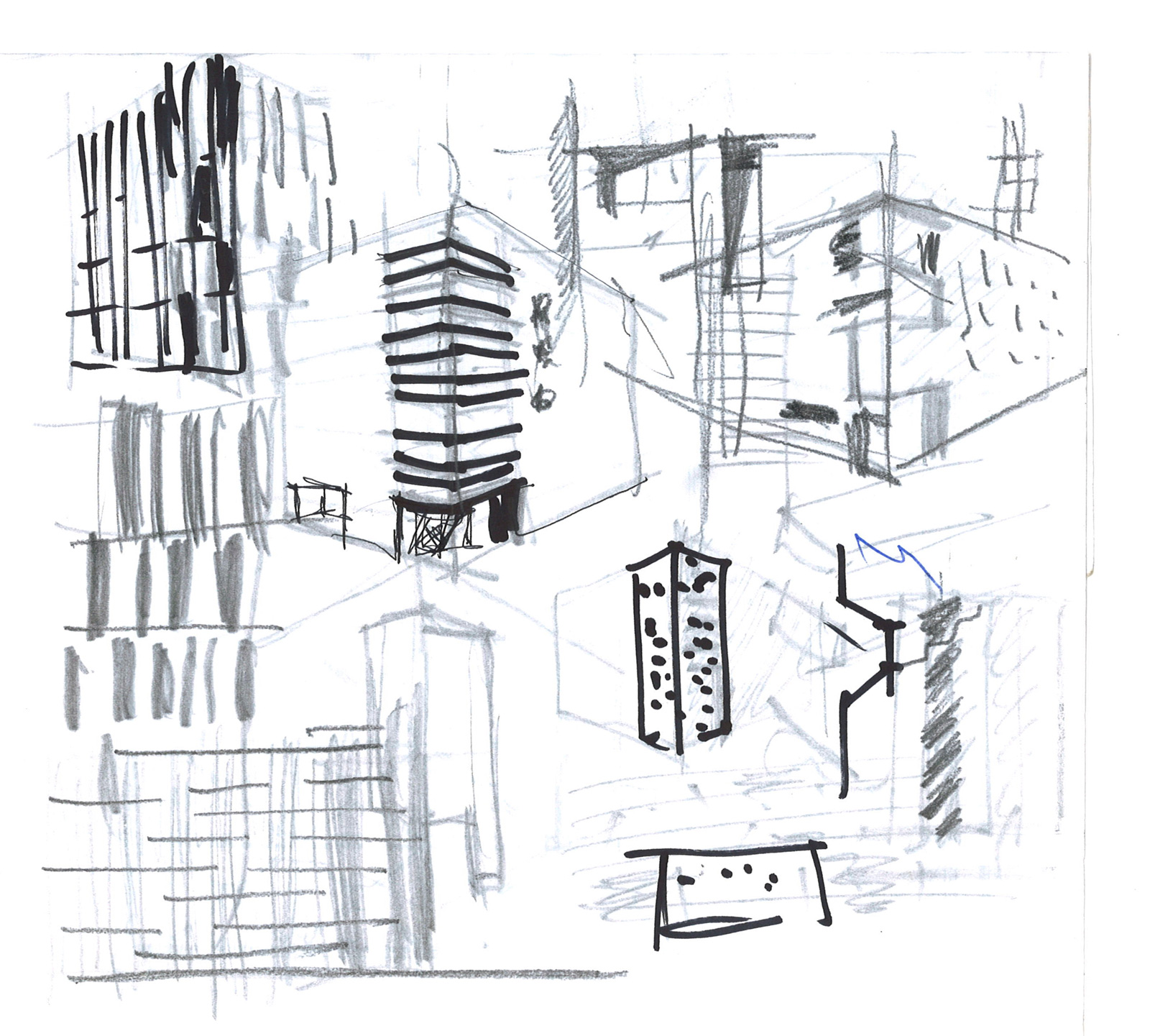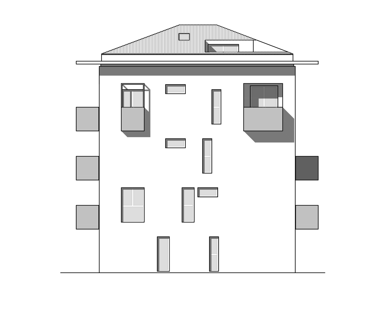 Il tema compositivo trae spunto dal contrasto ottenuto in facciata tra il perimetro regolare,leggibile, e la casualità controllata delle aperture (porte e finestre) che su questa si muovono in libertà,restituendo un senso di leggerezza. La regolarità dei volumi riprende il genius loci delle palazzine presenti in zona ed in genere appartenente all’edificazione anni 60-70, mentre il dinamismo delle aperture richiama certa architettura italiana che trova in L. C .Dominioni il referente più autorevole.