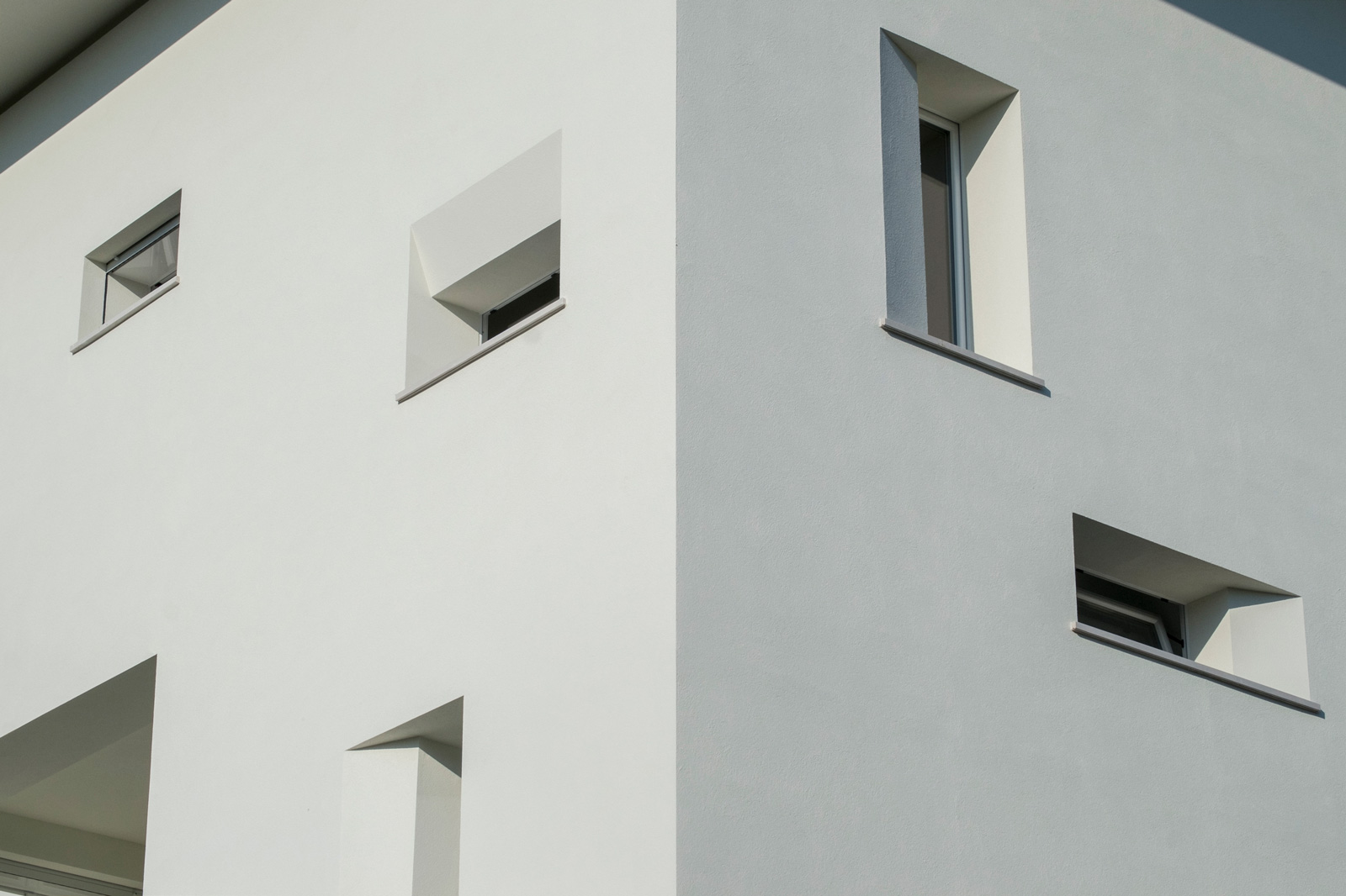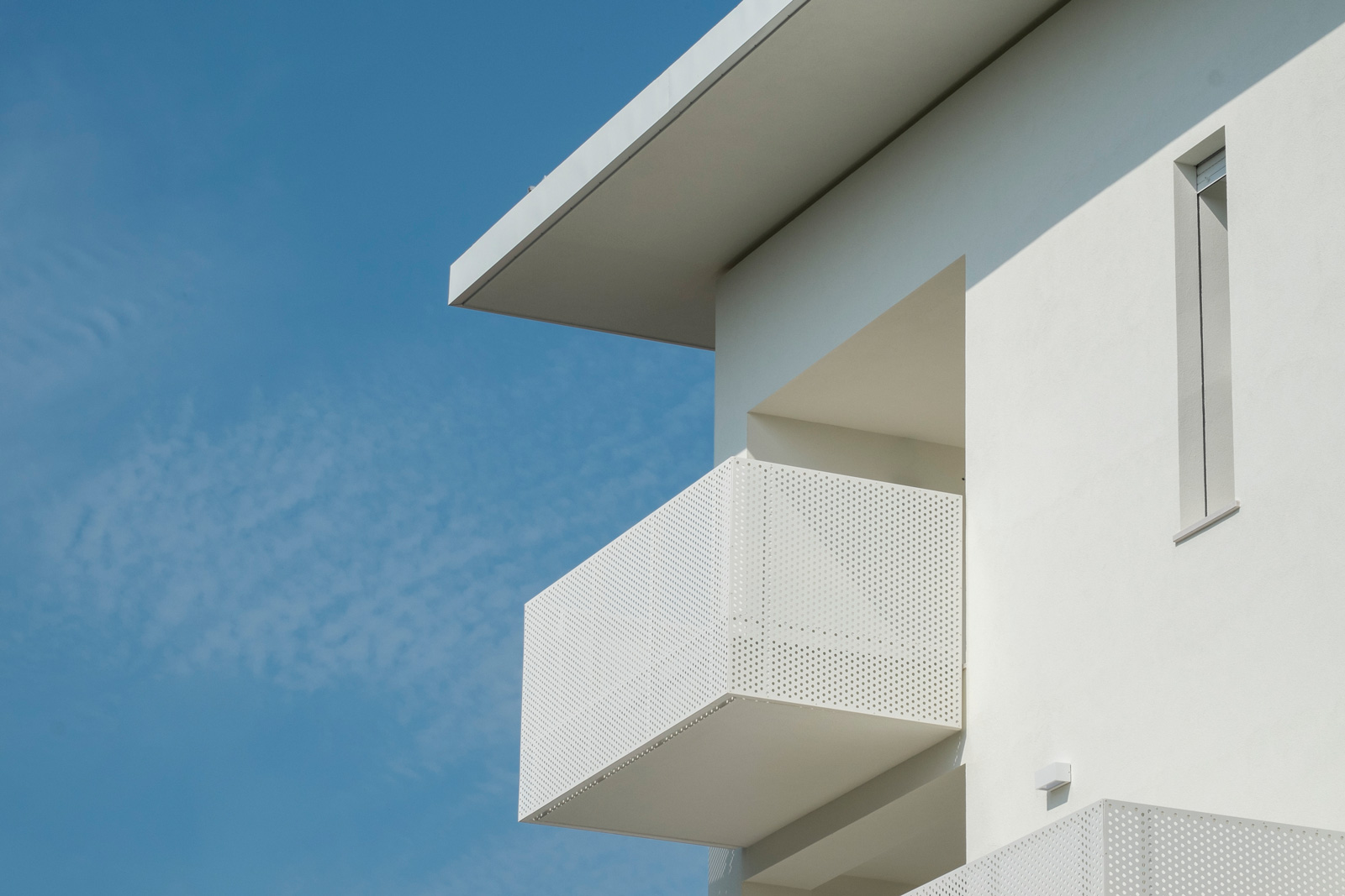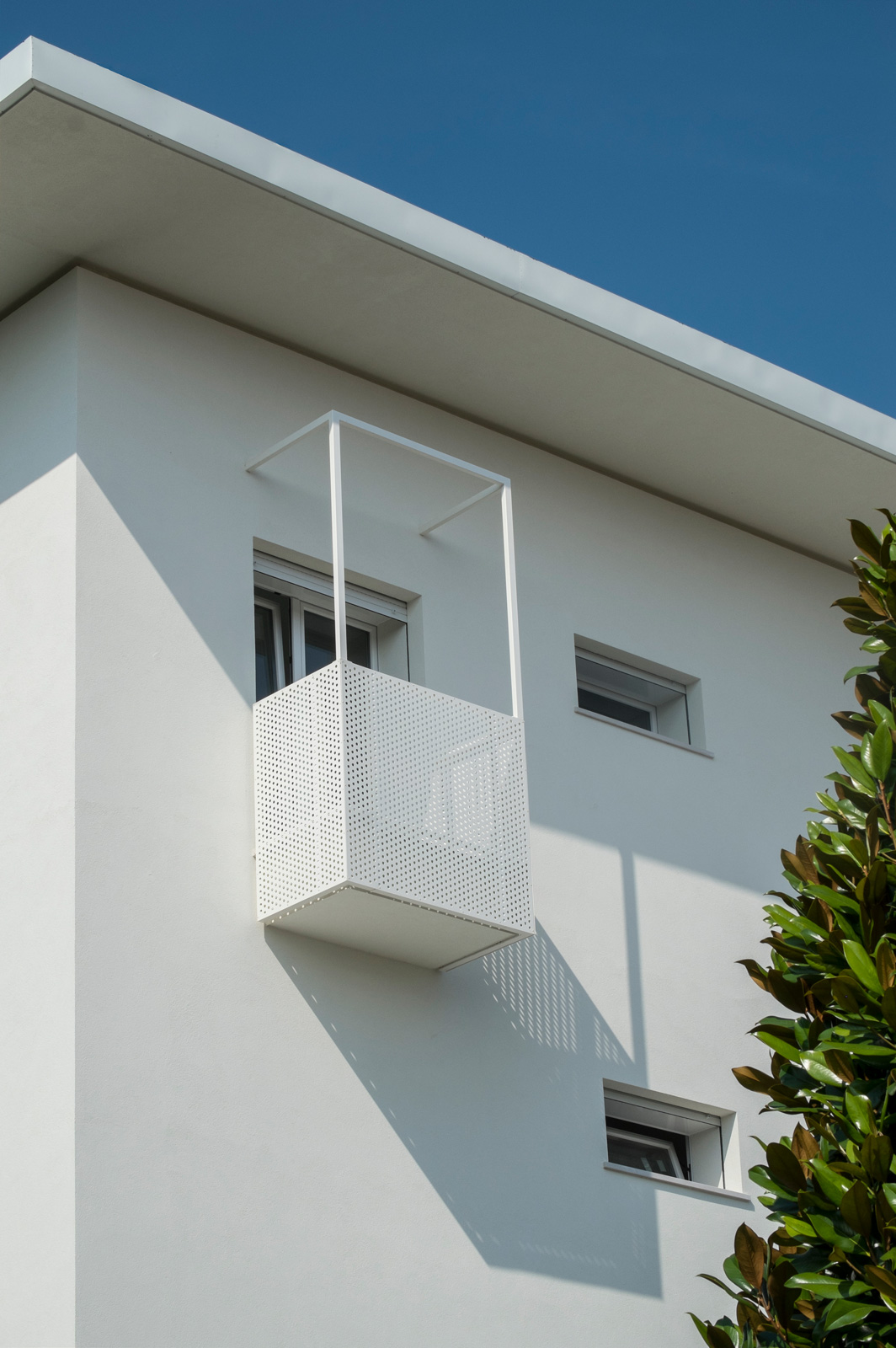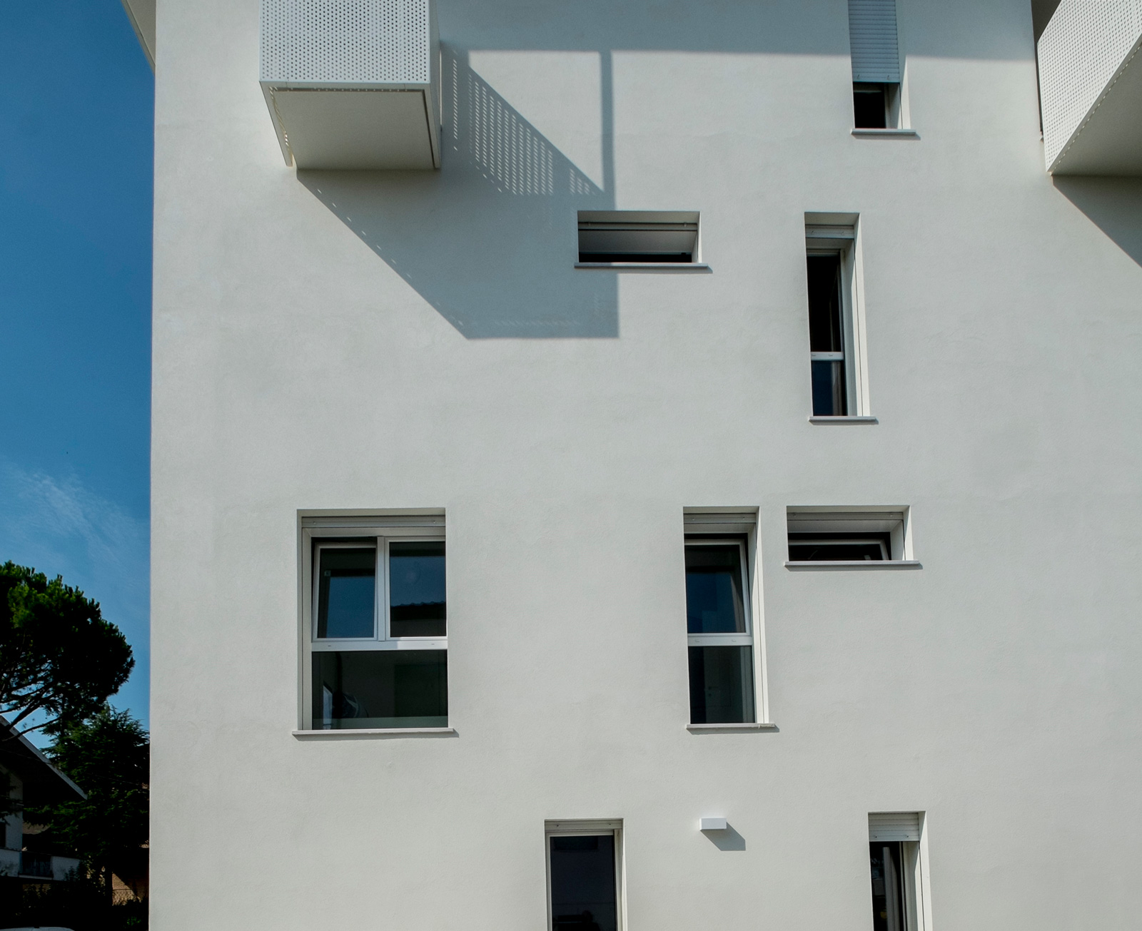 Gli infissi esterni sono realizzati in pvc ,così come i sistemi di oscuramento; le porte-finestre presentano la parte bassa dell’infisso non apribile, che funge da parapetto. In questo modo non vengono aggiunte ringhiere di altro materiale , non coerenti con la nitidezza compositiva dell’insieme.
