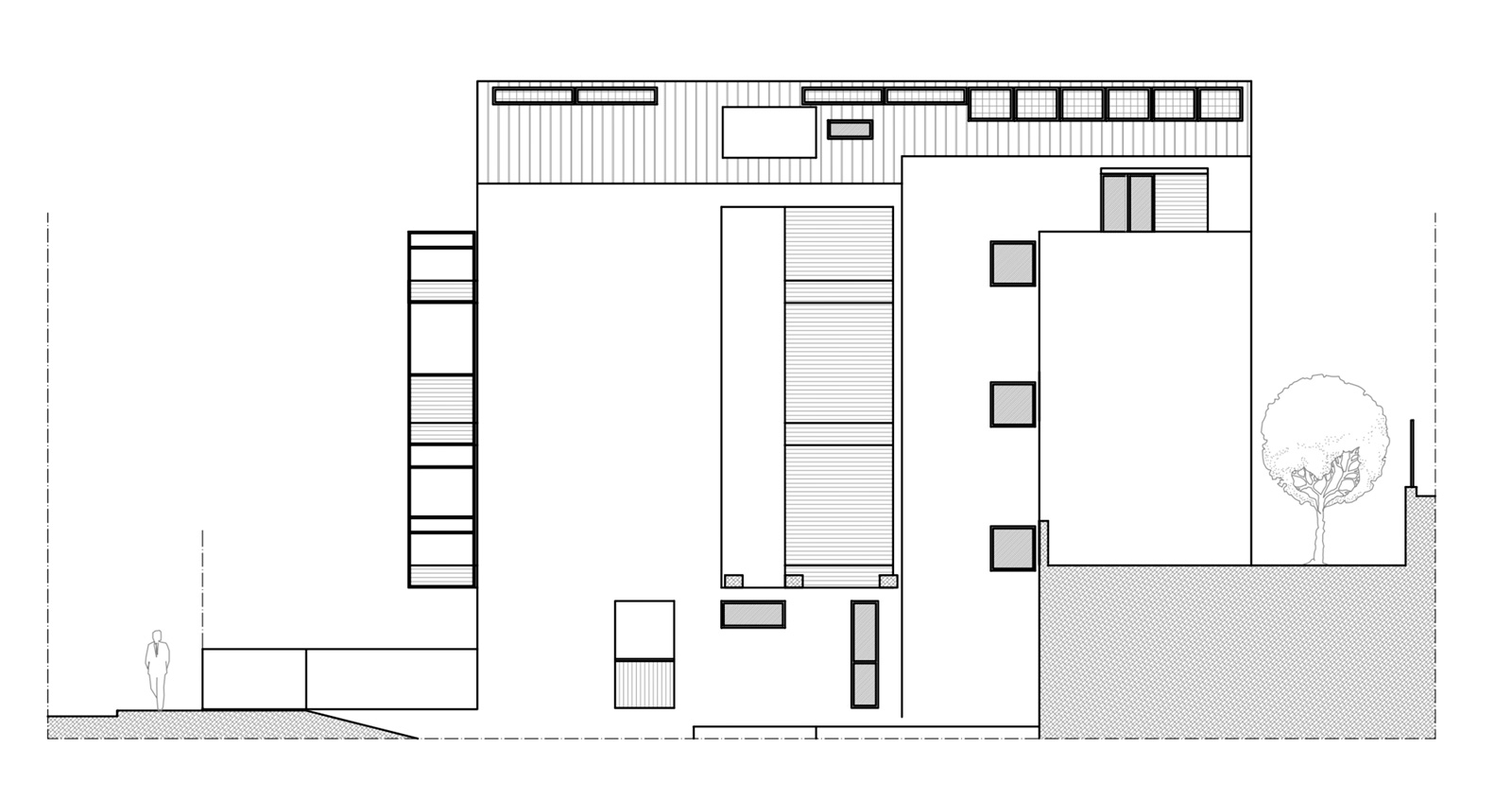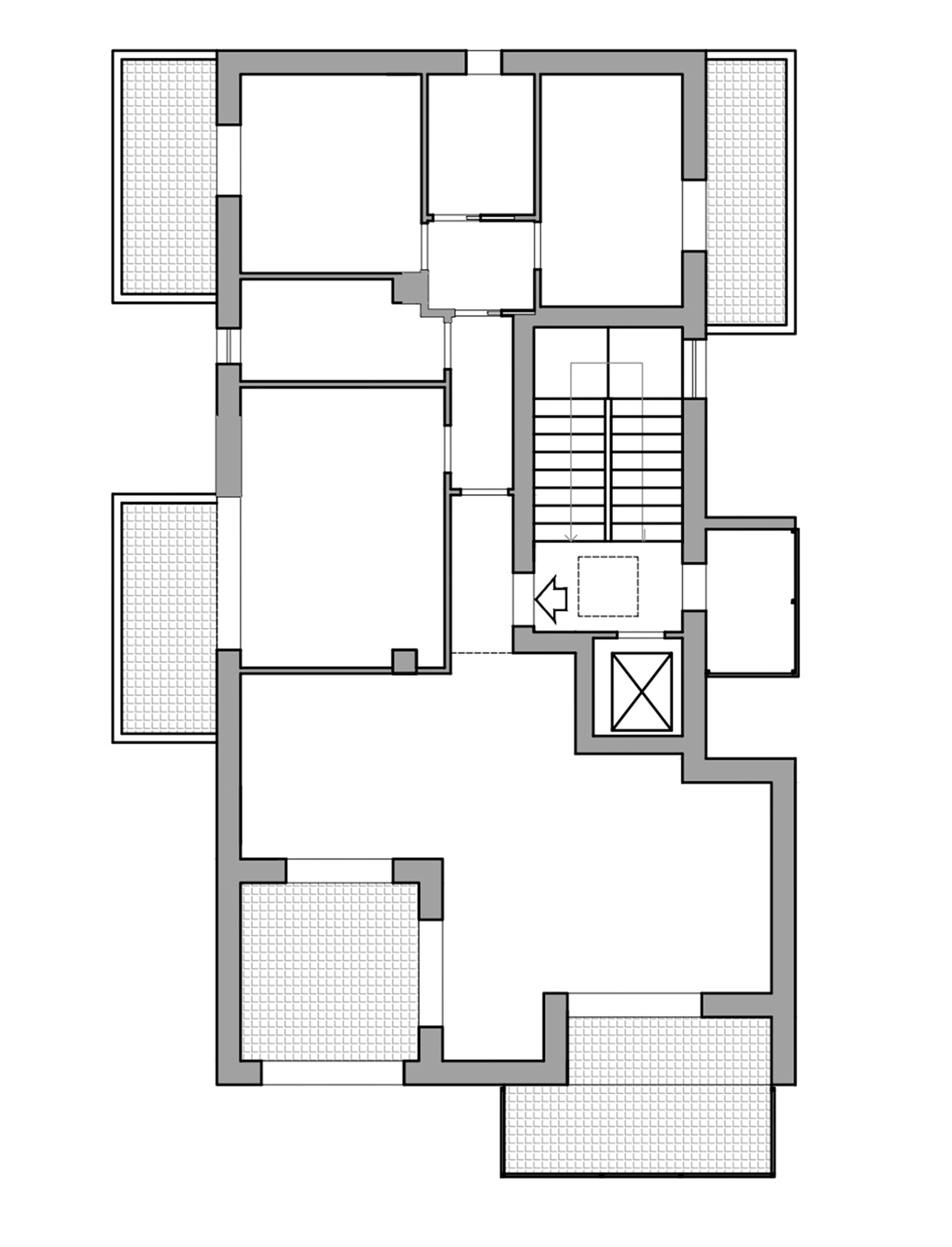 Il fabbricato, composto da un corpo principale di n. 4 livelli fuori terra, presenta una sagoma planimetrica situata all’interno di quella preesistente, così come il volume architettonico.