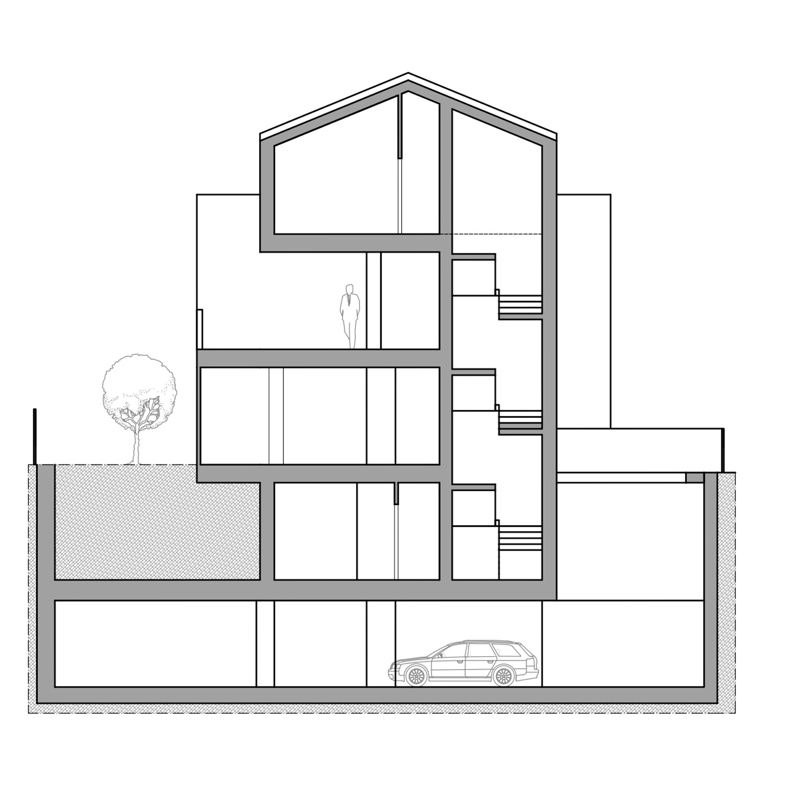 E’ presente un piano interrato ad uso parcheggio privato. Il lato Rimini del lotto è occupato dalla rampa carrabile di accesso. Un ascensore collega il piano interrato ai piani superiori. La copertura del nuovo edificio è del tipo a capanna.