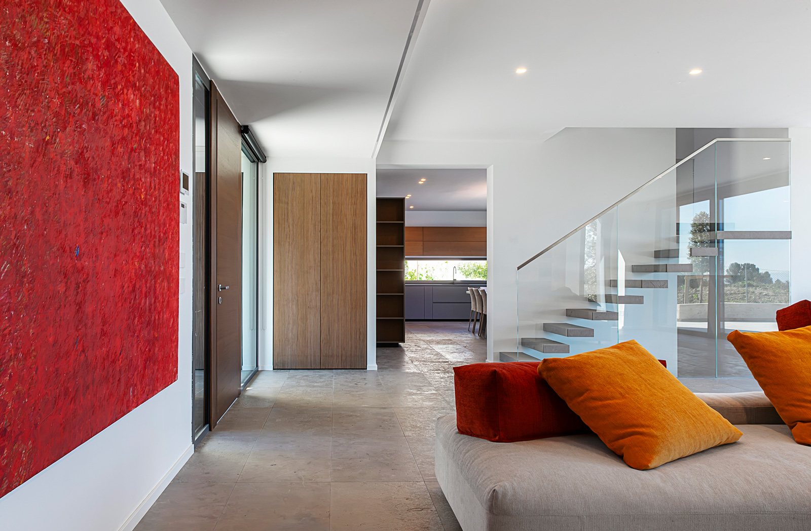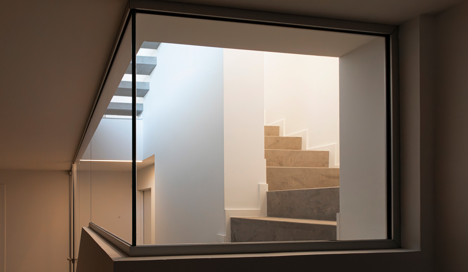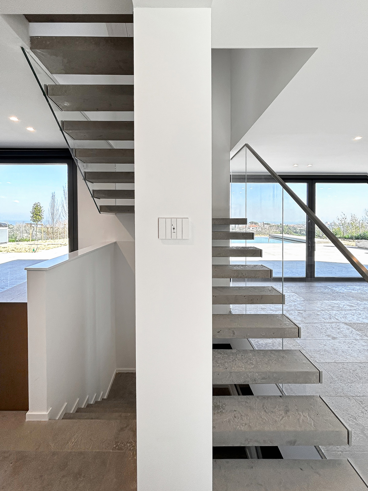 La scala interna è concepita come elemento leggero e trasparente, costituita da gradini a sbalzo in pietra Almont (la stessa di tutta la pavimentazione interna del piano terra ed esterna) collegati al muro centrale che divide le rampe. I parapetti in vetro trasparente svolgono una funzione stabilizzatrice.