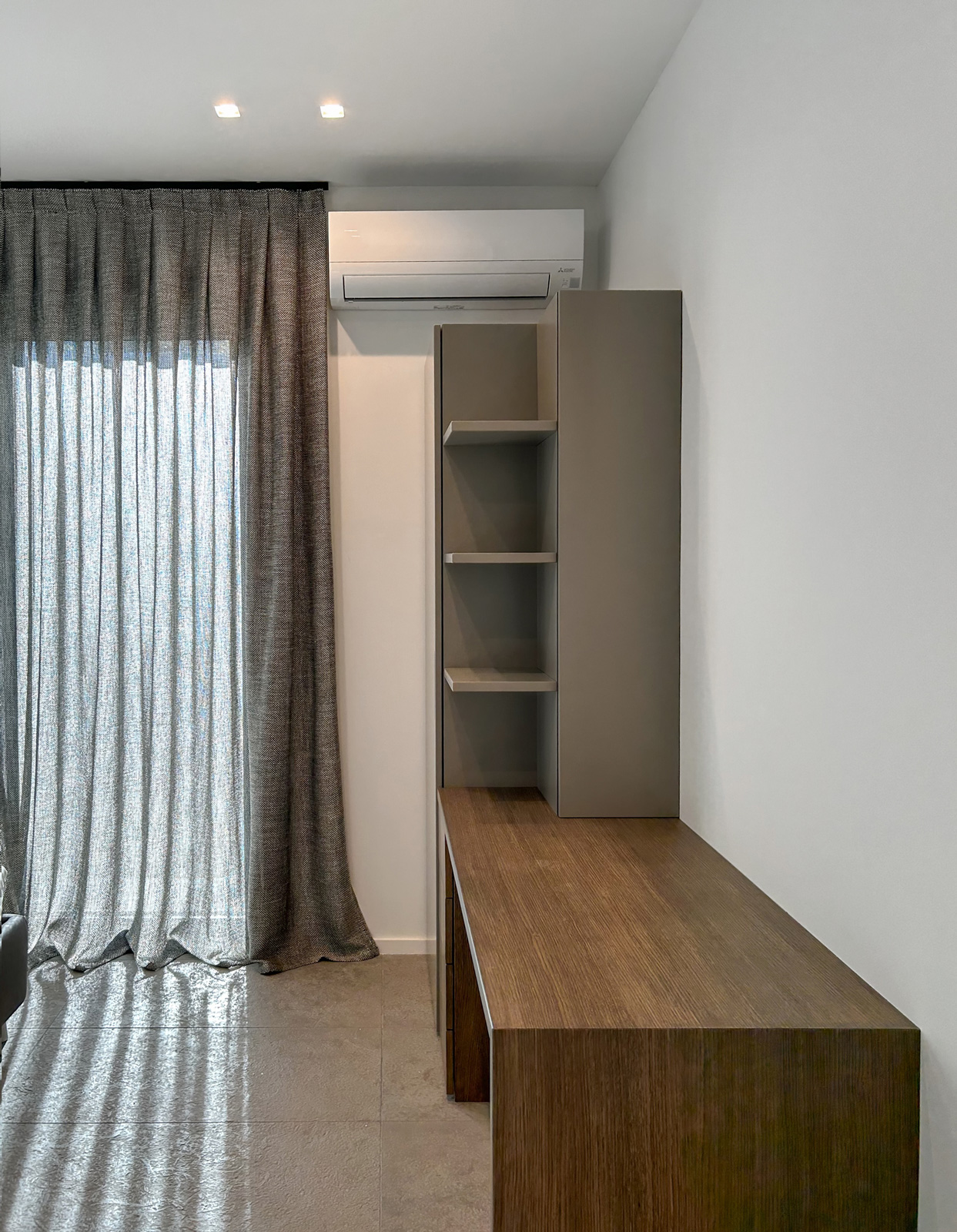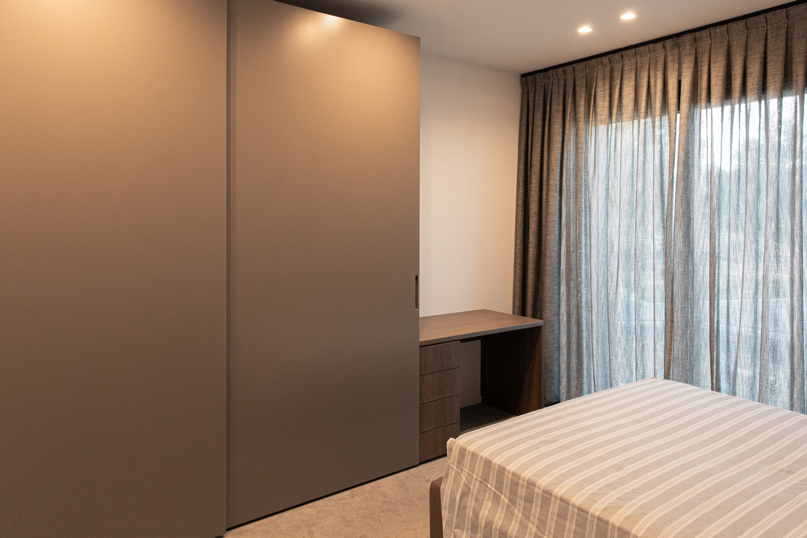 I tendaggi delle camere sono realizzati con un tessuto melangiato semi-trasparente con cromatismi grigi tono su tono, mentre le tende oscuranti elettrificate degli spazi a giorno di tipo avvolgibile garantiscono il controllo della luminosità durante le ore diurne