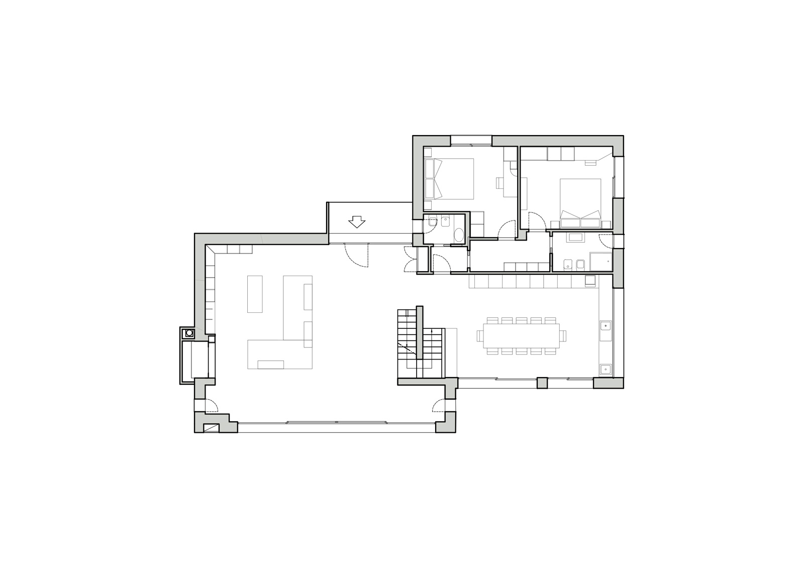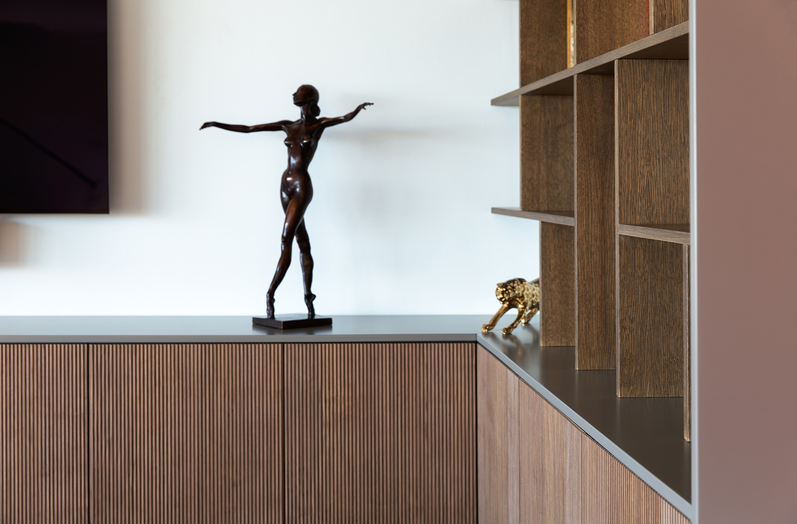 Nel grande soggiorno del piano terra la progettazione degli arredi assume una forma planimetrica ad “elle” comprendendo anche il camino ; da qui parte un elemento basso e compatto che in prossimità dell’angolo diviene base per una alta scaffalatura a giorno, caratterizzata da elementi divisori disassati. Il materiale utilizzato è il legno rovere a vista, nella sua veste piana e scanalata, ed il legno laccato di colore grigio.