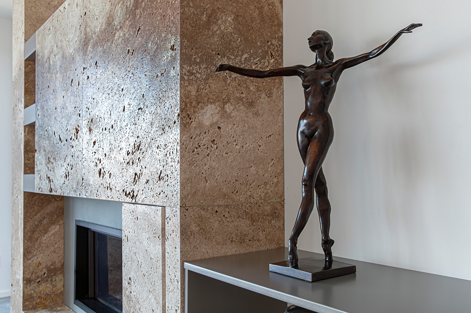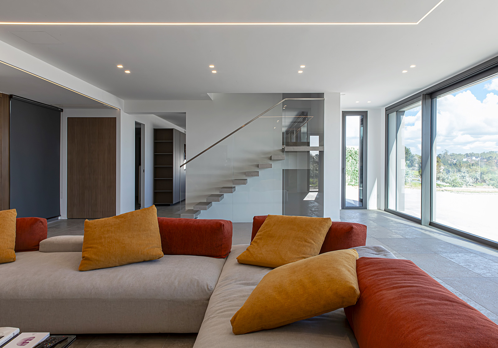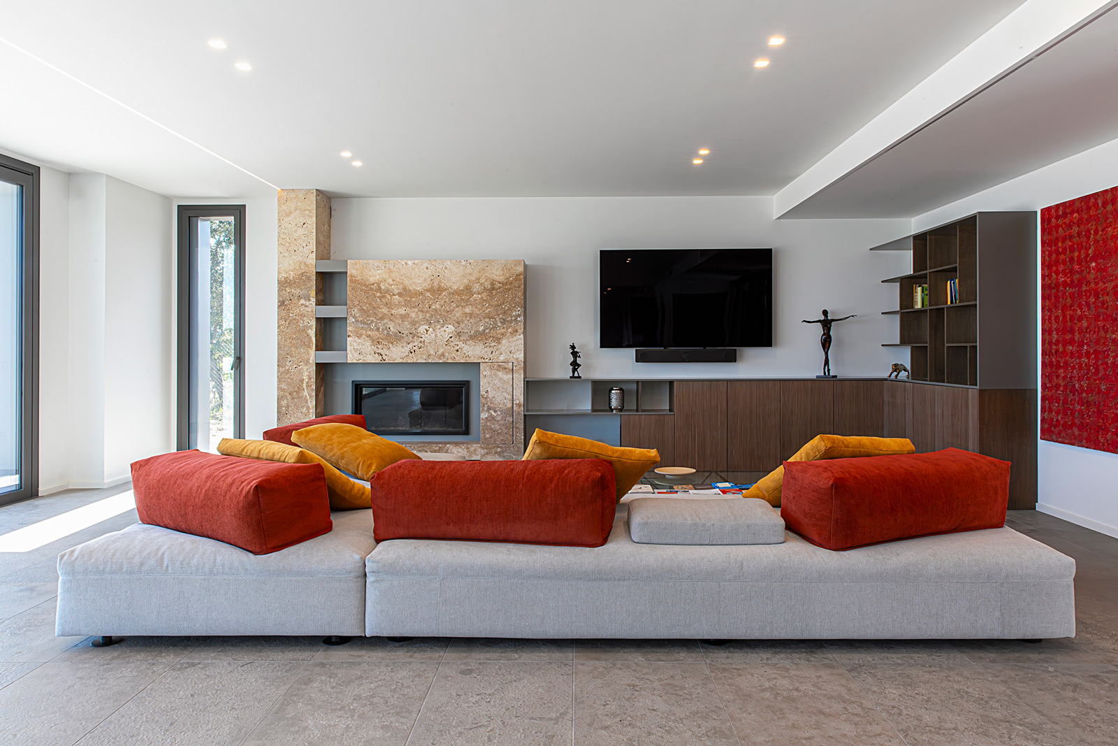 Il camino è stato pensato come elemento architettonico in grado di disegnare esteticamente lo spazio del living. Costituito da una struttura in acciaio e cartongesso, è totalmente rivestito in pietra Travertino Rapolano, come la piscina esterna e le due sedute che delimitano la piazza. La grande vetrata è quadripartita; le due ante centrali scorrono lateralmente consentendo una vista continua della piscina esterna fino al mare ; la pavimentazione in lastre di Pietra Almont , non levigata e spazzolata, dall’interno prosegue su tutta la piazza esterna.