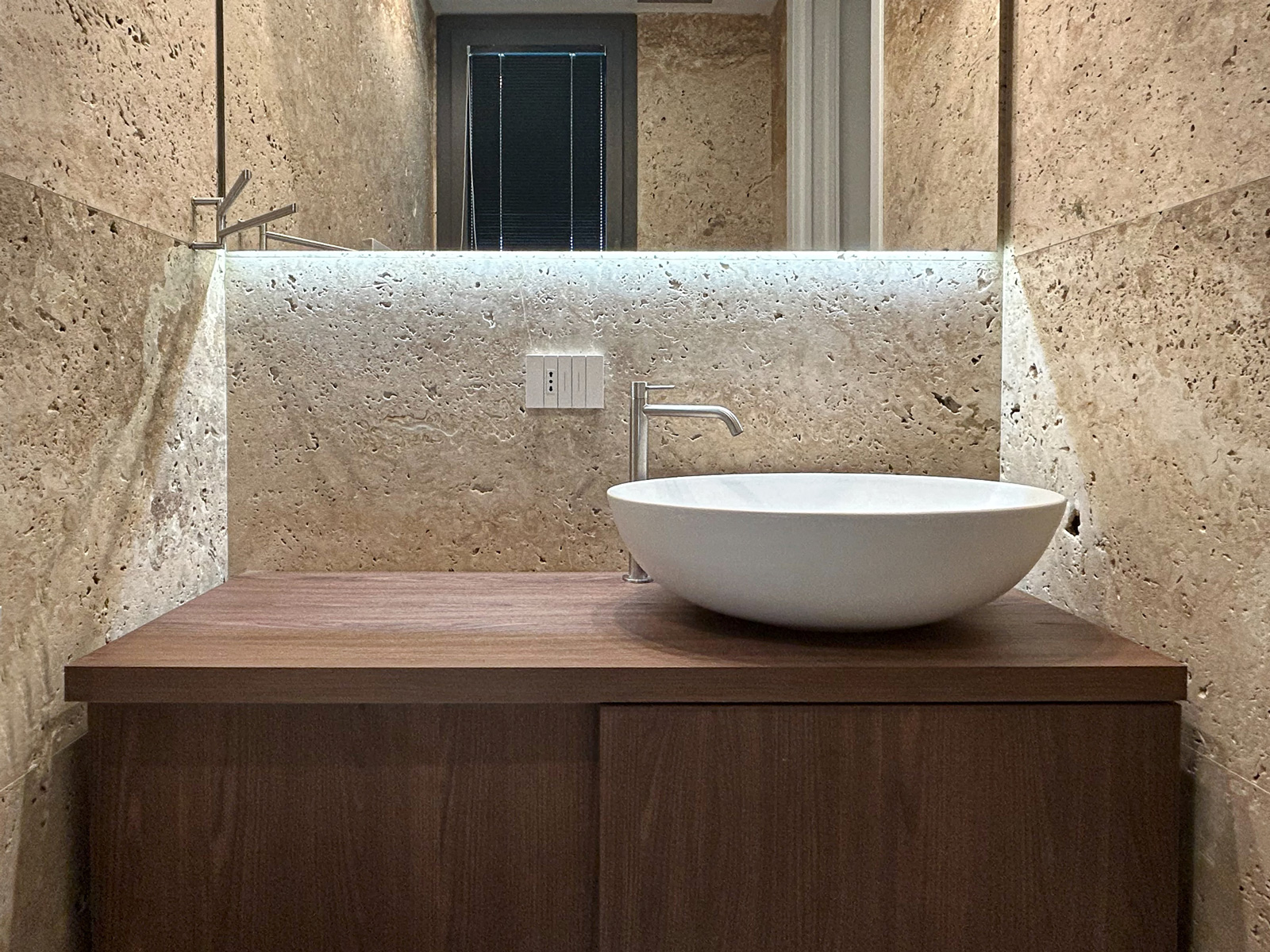 Il bagno ospiti è realizzato con lastre di Travertino Rapolano a “poro aperto” a tutta altezza, dove la luce si sofferma creando un chiaro-scuro materico di grande suggestione.