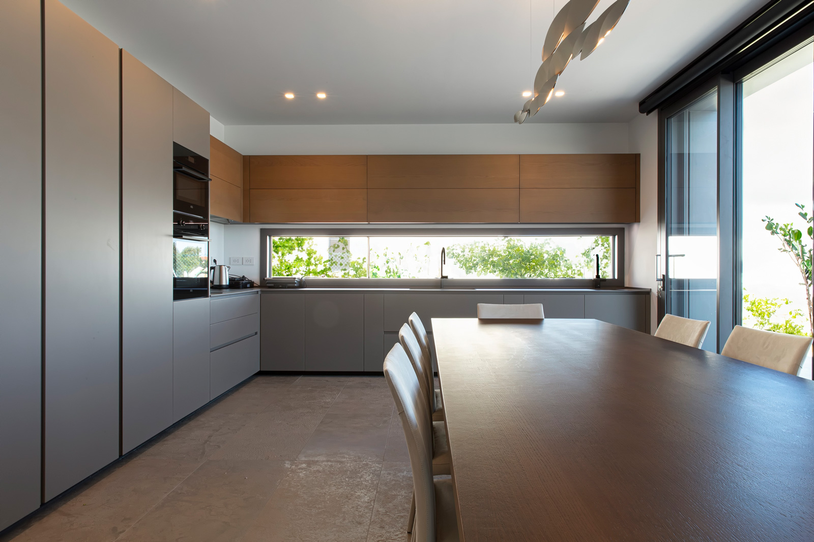 Il mobile cucina è formato da una parte compatta a tutta altezza per poi divenire piano di lavoro e struttura pensile, permettendo così la vista del giardino esterno tramite una lunga vetrata fissa.